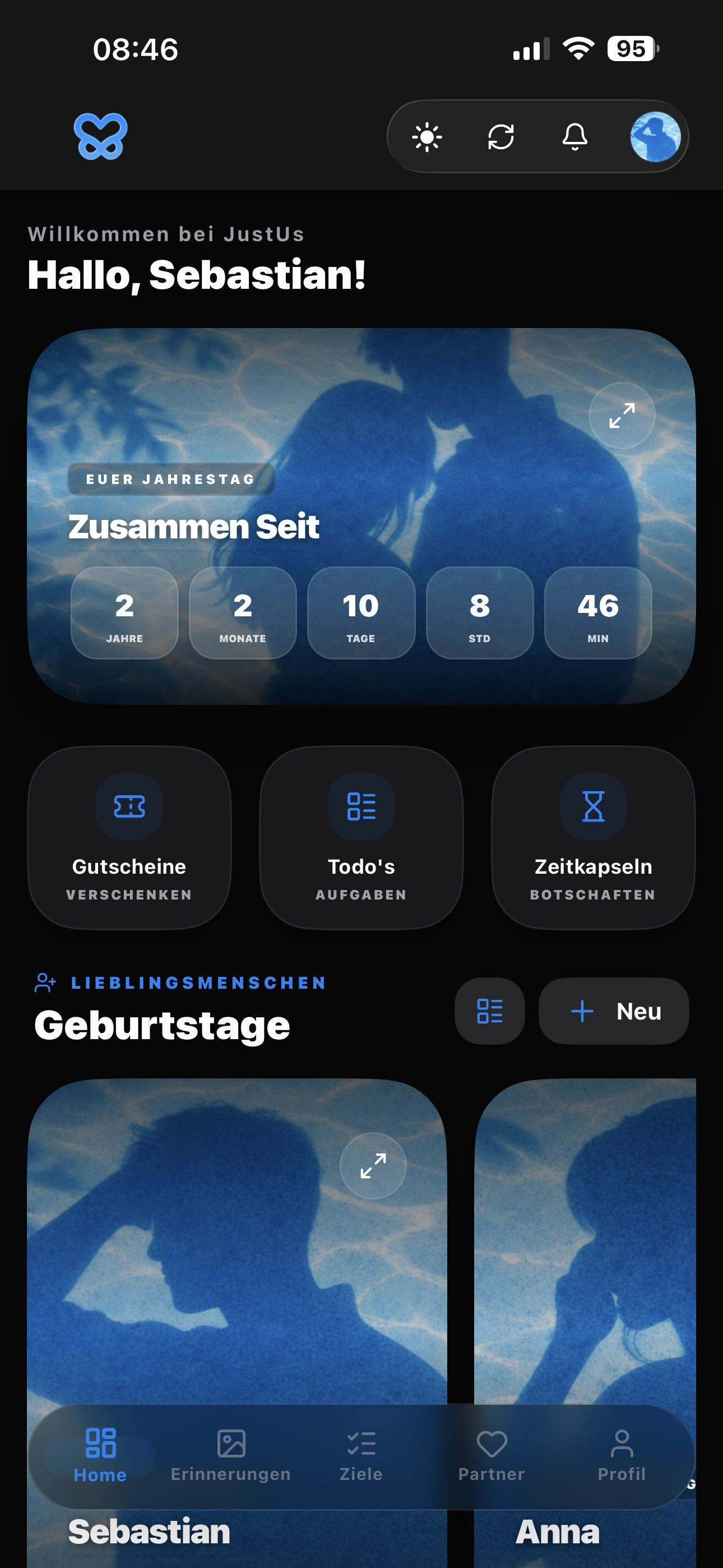Lade deinen Partner ein und synchronisiere alles in Echtzeit. JustUs ist für zwei gemacht.